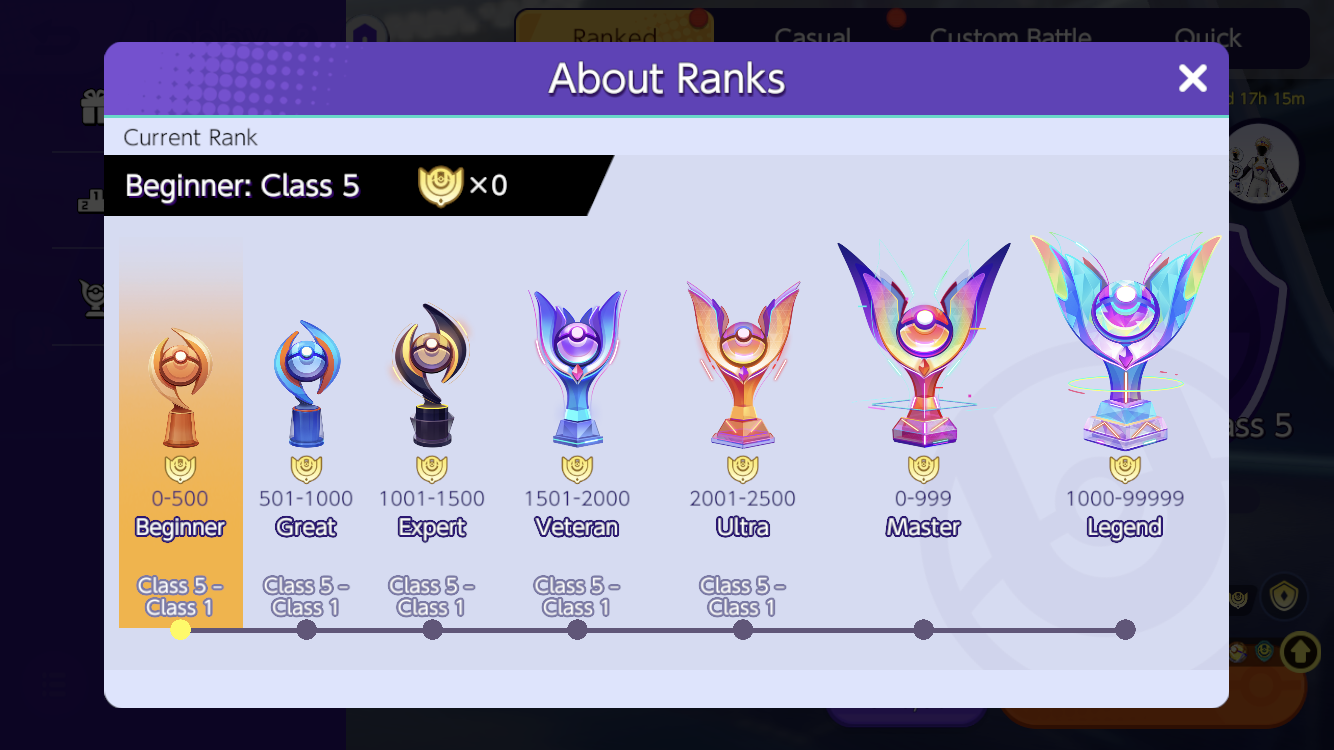 - Ranks are subdivided into classes, and the player’s progress in each rank class will be shown on a rank point gauge. The player will receive rank points based on the results of ranked matches, and those rank points will go toward the rank point gauge. If the rank point gauge becomes full, the player’s rank class increases. If the rank point gauge becomes less than zero, the player’s rank class decreases. If the player advances past the highest class for their rank, their rank itself will increase, and their class will become the lowest class for their new rank.